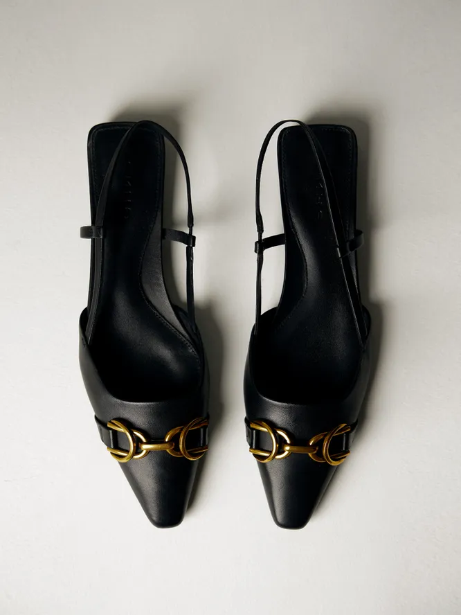 От этик шикарных туфелек веет атмосферой ретро, но в этом как раз весь их шарм! Острый нос, золотой декор, плоская подошва — в таких зажигали ещё в 90-е. Сотый раз убеждаемся, что мода циклична, поэтому советуем приобрести эту стильную пару для празднования Нового года и корпоратива!