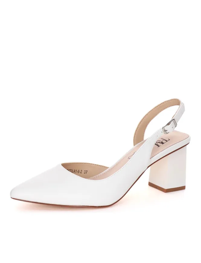Белые слингбэки на устойчивом каблуке смогут стать дополнением практически любого образа: с брюками и белой рубашкой, с пастельным платьем в пол и с яркой юбкой с пайетками и топом с перьями!