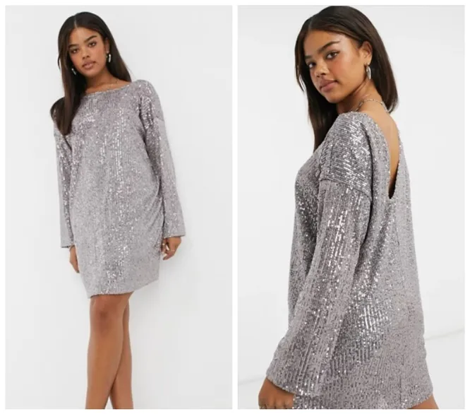 Asos Design, Серебристое мини-платье с пайетками и v-образным вырезом на спине, 3390 руб