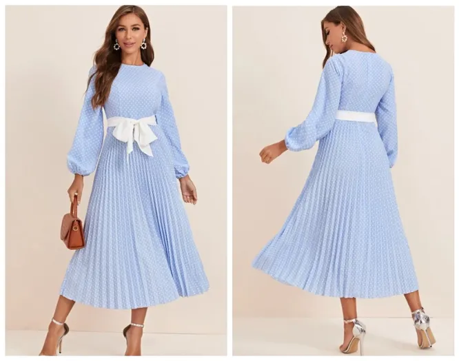 Shein, Плиссированное платье в горошек с рукавом-фонариком и поясом, 1640 руб