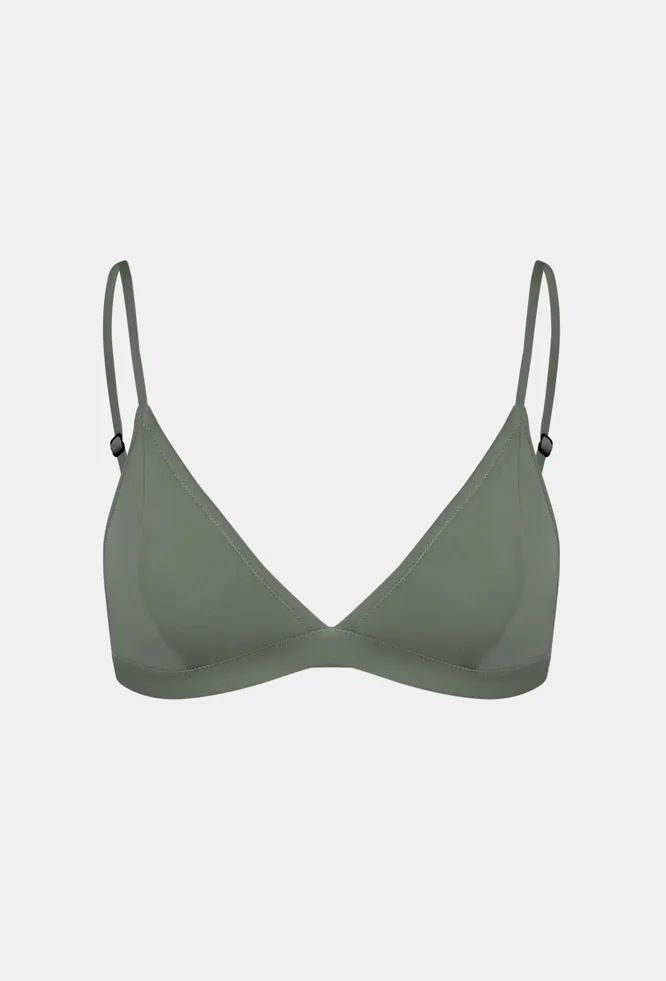 Благородного оливкового цвета купальник очень красиво смотрится на загорелой коже. Его модель слегка иная, здесь более широкие лямки и отрезок ткани под чащками, но такой вариант, вероятно, хорошо подойдет женщинам с большой грудью.