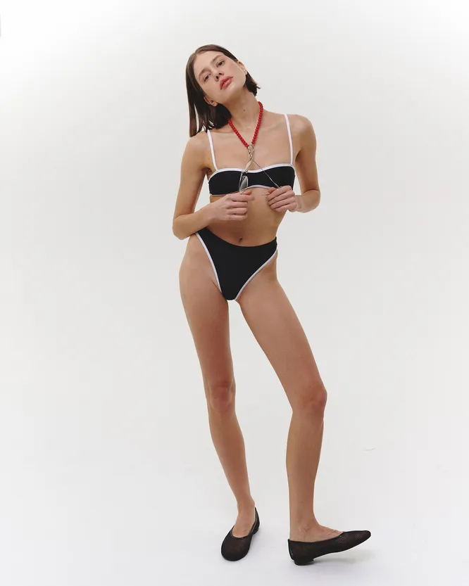 Купальники с акцентным краем очень популярны, поэтому вы встретите варианты совершенно разных цветов. Для любительниц классики нашли слитную модель, где главенствует черный цвет.