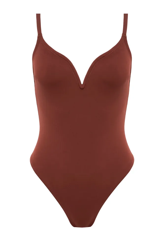 Вот еще одна модель слитного купальника кирпичного цвета, но с акцентной зоной декольте и открытой спиной.