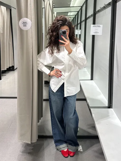 MAAG всегда умеет подкупить универсальностью. Здесь я снова сделала ставку на трансформируемость образа. Первый комплект — белая рубашка, джинсы прямого кроя и трендовые балетки. Абсолютный офисный маст-хэв: строго, чисто, но не скучно. Стоит только убрать рубашку, заменить её на топ или добавить акцентное украшение — и вот уже вечерний выход.