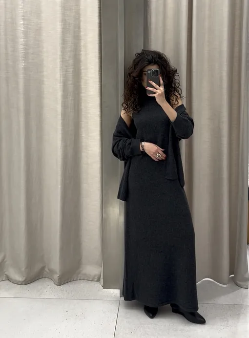 Второй образ — шерстяное платье в паре с кардиганом в меланжевом оттенке. Представьте: утро, кофе навынос, прогулка по городу, и на вас этот теплый, но при этом стильный дуэт. Настолько удачная находка, что я всерьез думаю за ней вернуться.