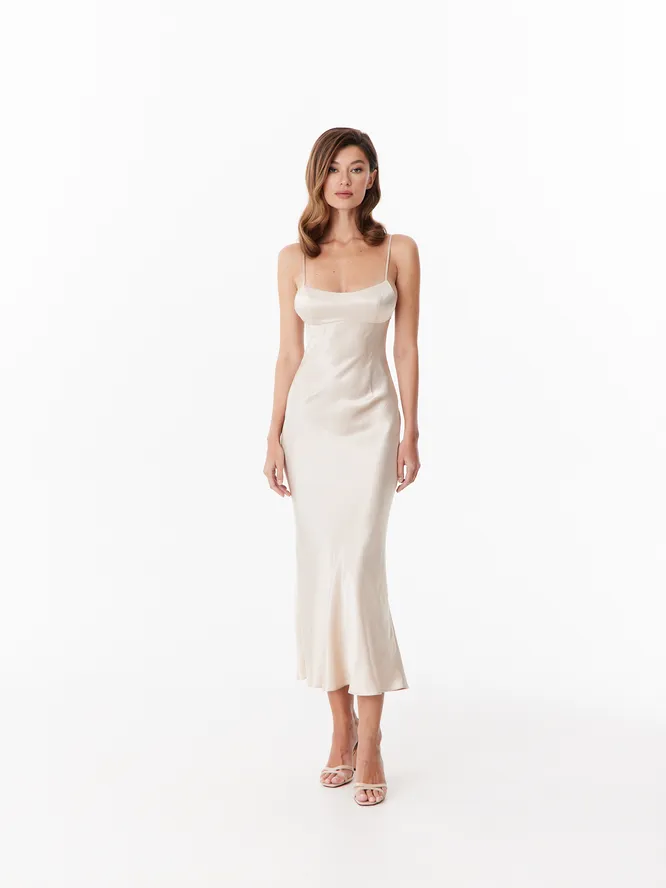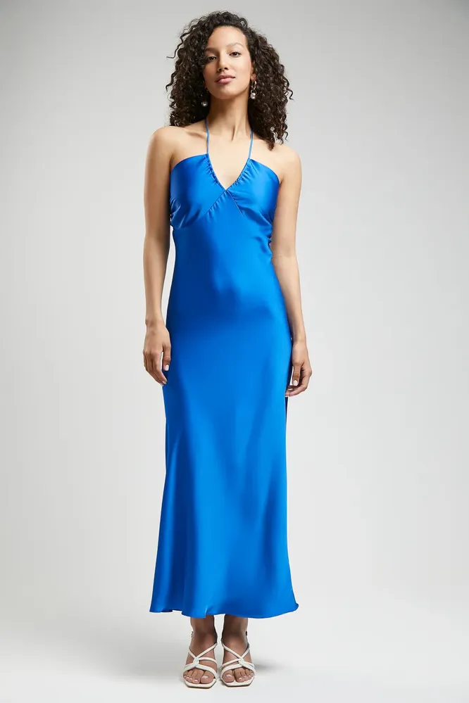 Ультрамодный цвет, который идёт большинству! Атласное платье в оттенке электрик станет вашим мастхэвом на любое мероприятие и, конечно же, на корпоратив. Накиньте на плечи белый пиджак и наденьте туфли в тон. Аксессуары лучше выбрать серебристые.