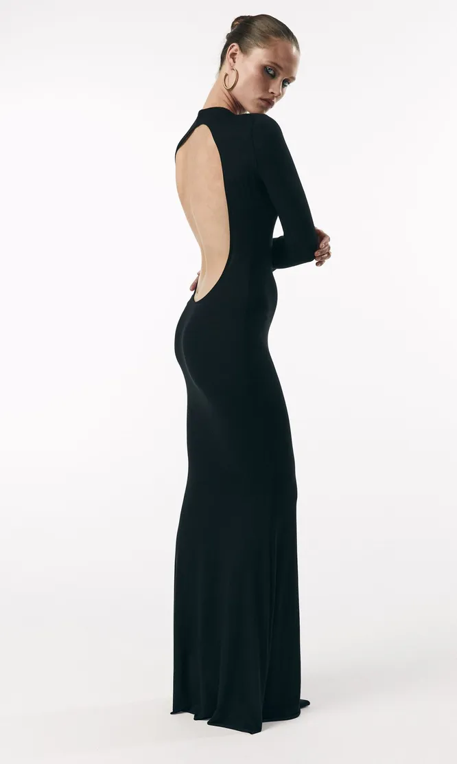 Такое бы точно надела Мартиша Аддамс, пригласи ее на предновогоднюю вечеринку. Шикарное платье в пол почти полностью закрытое, за одним исключением: у него нескромный вырез на спине. Внимание и взгляды вслед обеспечены! Чтобы сделать образ ещё более роковым, добавьте массивные украшения и обувь на каблуке, макияж глаз сделайте дымчатым, а волосы соберите.