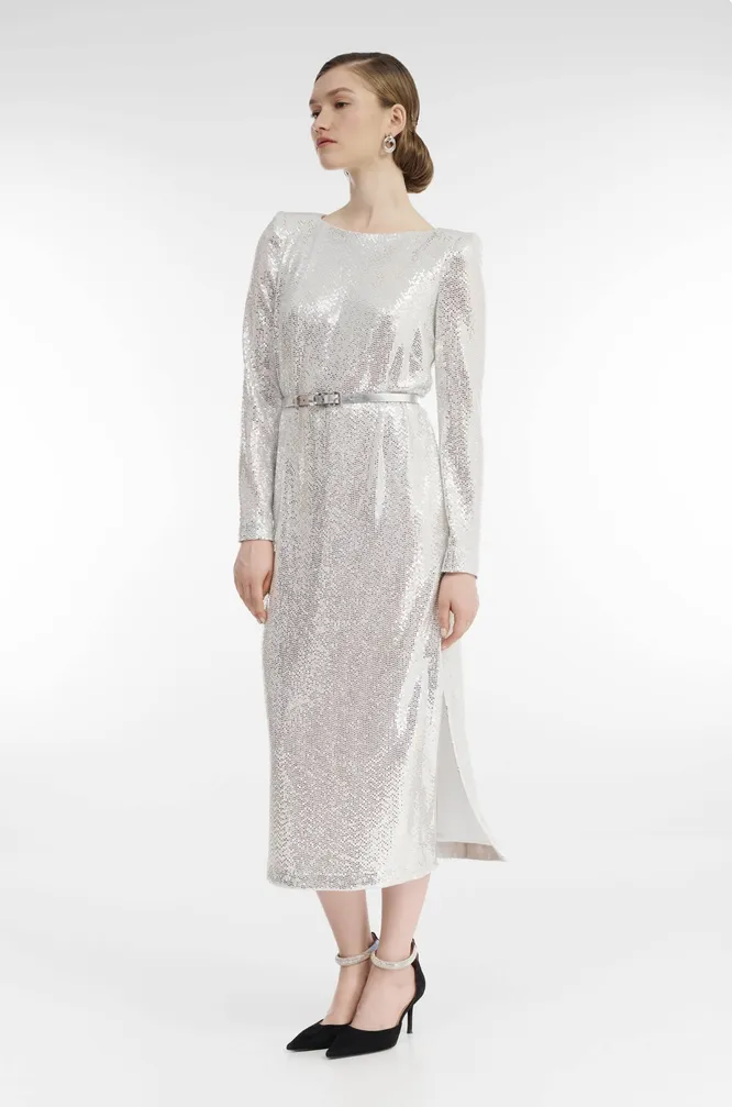 Более скромный вариант, но не менее стильный. Серебряное платье с длинным рукавом ниже колена имеет интересную деталь — разрез, который деликатно приоткрывает ноги. Вы можете дополнить наряд чёрными остроносыми туфлями с серебряным ремешком и аксессуарами, которые будут перекликаться с образом.