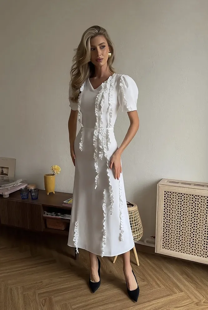 Если вы хотите образ в стиле «девочка-девочка», то белое платье с пышными рукавами и рюшами — один из вариантов. Самое приятное, что такая модель подойдет и для праздничного мероприятия, и для обычной прогулки летом. В данном случае многое решают аксессуары. На корпоративе можно не скромничать в выборе украшений и обуви, так что достаньте любимые аксессуары и лодочки на шпильке.