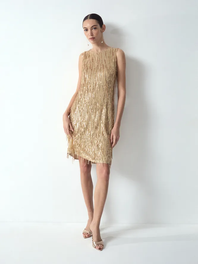 Платье в стиле знаменитых вечеринок Гэтсби, золотой каскад пайеток напоминает брызги шампанского. Идеальный вариант для предновогодней вечеринки! Дополните платье аксессуарами и обувью в тон, а волосы соберите в низкий пучок. Чтобы танцевать ночь напролёт, выберите туфли на «бабушкином каблуке».