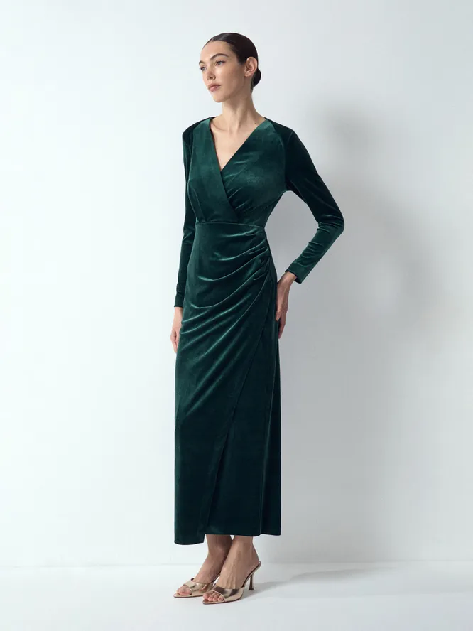 Роскошное платье, которое подчеркнет талию и грудь. Кстати, зелёный — цвет символа Нового года, поэтому однозначно стоит приобрести такое платье на грядущие праздники. Не забудьте про аксессуары и обувь! К изумрудному лучше всего подходят золотые детали.