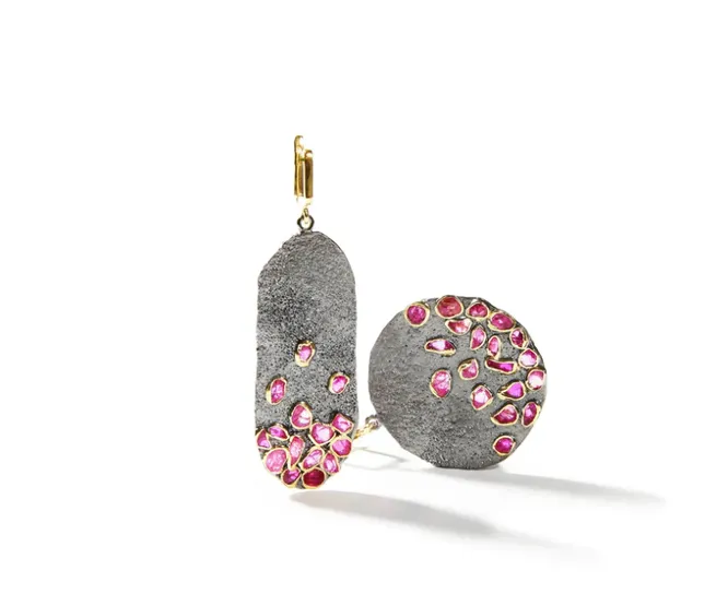 Это еще один пример синтеза дикого и искусственного; на этот раз более изящный и минималистичный, что легко объяснить историей художницы, создательницы бренда Most Art Metal. Полина Митяева училась в петербургском университете Штиглица, а затем — в Финляндии, в Lahti University of Applied Science. Она придумала необычную технологию, при которой мелкие драгоценные камни не инкрустируются в украшение из серебра, а отливаются вместе с ним, благодаря чему ни одно ее украшение не похоже на другое, и каждое выглядит так, словно создано самой природой.