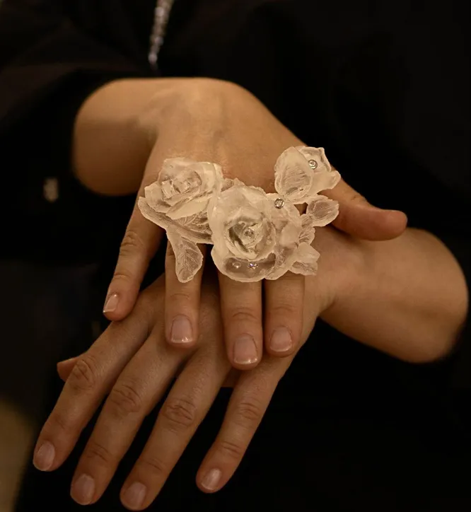Sophia Artist — скорее художник, чем ювелир. Она не гонится за серийностью и повторяемостью и смело миксует материалы из разных категорий: современные и технологичные — с классическими ювелирными, драгоценные и скромные. Для воплощения самого нежного цветка художница взяла легчайший из полимеров, поместила это воздушное творение на шинку из ювелирной бронзы и украсила сверкающими капельками фианитов и золоченого титана.