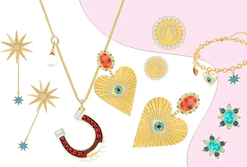 Винтажные мотивы и многообразие счастливых талисманов соединились в коллекции Lucky Goddess от Swarovski. Глаза Фатимы, подковы, крылья ангела несут удачу и защиту своим обладательницам. Сияние кристального pave подчеркнуто тончайшей обработкой металла и живописной палитрой от кораллово-красных до бирюзово-голубых оттенков на фоне теплого золота.