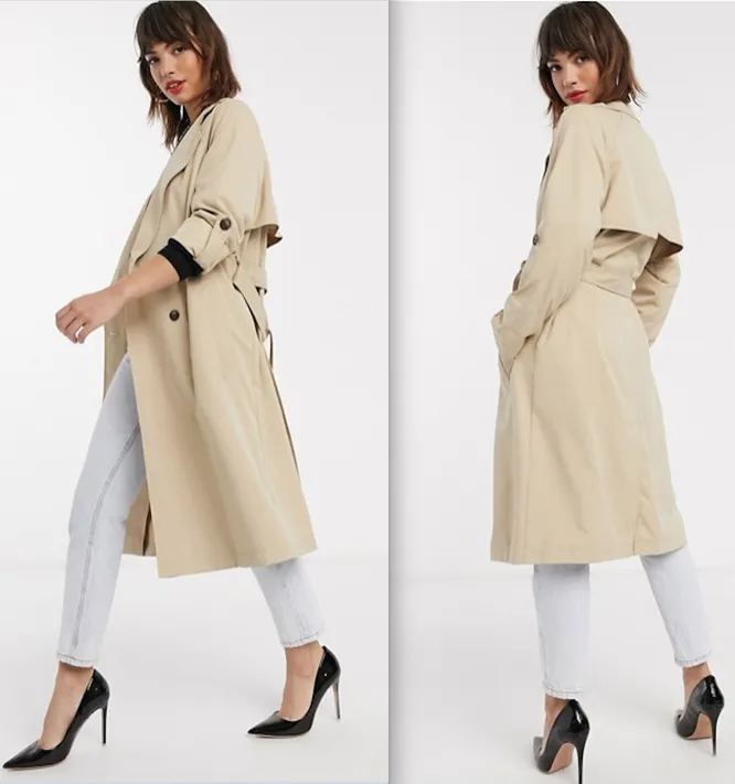 Тренч – в переводе с английского «траншейное пальто», защитит вас от непогоды в дождливый день. Классическая модель подразумевает длину до колена или чуть ниже, пояс, двубортную застежку и кокетку на спинке. Его можно смело сочетать и со спортивным стилем и с повседневным и с вечерним. Среди бежевых оттенков выбирайте тот, который вам больше к лицу – потемнее или посветлее.