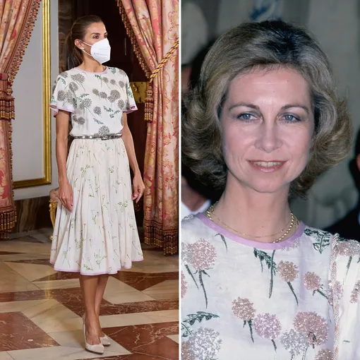 Еще одна королевская особа, которой не привыкать одалживать одежду у своей семьи, — королева Испании Летиция. Ее часто можно увидеть в винтажных нарядах, принадлежащих ее свекрови, королеве Софии. Так, в сентябре 2021 года Летиция выла в свет в потрясающем бледно-розовом платье с рукавами-крылышками, расклешённой юбкой и лифом, расшитым металлизированными нитями. Впервые наряд на публике продемонстрировала королева София – монархиня надела его во время поездки в Рим в 1981 году. Это платье украсит любую женщину, но, если выбирать, то отдаём предпочтение королеве Летиции. Во-первых, такой оттенок розового лучше смотрится на загорелой коже. Во-вторых, будем честны: на этой безупречной фигуре даже мешок будет выглядеть великолепно!