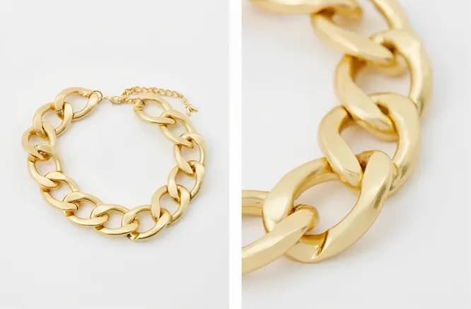 Бижутерную цепь от бренда Patrizia Pepe с крупными изогнутыми звеньями можно носить как массивный чокер или колье. Украшение дополнит нестрогий офисный образ и хорошо будет смотреться с белыми и чёрными рубашками, блузами с геометрическим рисунком, оверсайз-жакетами из текстурированной и гладкой ткани.