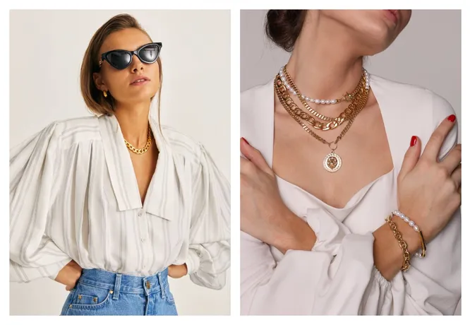 Колье-цепь от российского бренда Yaroslavna — удачный компромисс между минимализмом и желанием добавить украшению блеска натуральных камней. Несмотря на внушительный размер звеньев (часть из их — текстурированы), наличие крупной гравированной подвески и бонус в виде барочного жемчуга, колье будет смотреться элегантно в комплекте с нюдовым или белым тотал-луком.