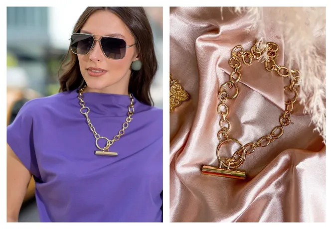 Поклонникам сложной геометрии понравится колье от российского бренда Ruxara. Украшение, представляющее собой ряд колец разного диаметра, которые скрепляет крупная Т-образная застёжка, доступно в одном размере. Но при желании всегда можно убрать несколько звеньев, чтобы колье стало короче.