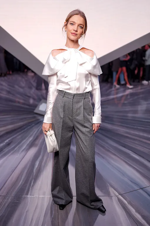 Образ Натальи на мероприятии Dior сочетает утонченную романтику и строгую классику. Атласная блуза молочного оттенка с массивным бантом гармонично соседствует с широкими серыми шерстяными брюками и минималистичной сумкой. Образ завершает пара элегантных лодочек, которые придают силуэту изящество и визуально вытягивают ногу. В этом look’е важна детализация: романтические элементы блузы уравновешены строгостью брюк, а минимализм аксессуаров подчеркивает изысканность ткани.