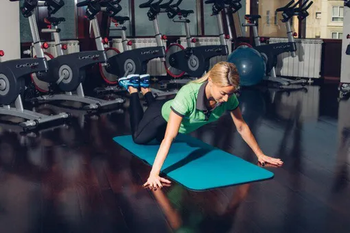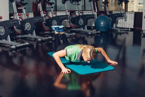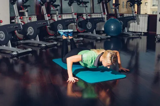 — Примите положение планки на коленях. Руки шире плеч, бедра на одной линии с корпусом — тело образует прямую линию.