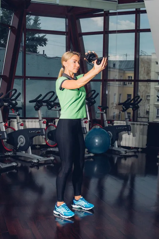 — Встаньте ровно, стопы примерно на ширине плеч, держите гантель, как показано на фото: одна рука вдоль корпуса, согнута с локтевом суставе, угол 90 градусов, вторая рука параллельна полу. Сгибаем плечо и разгибаем 16 раз.