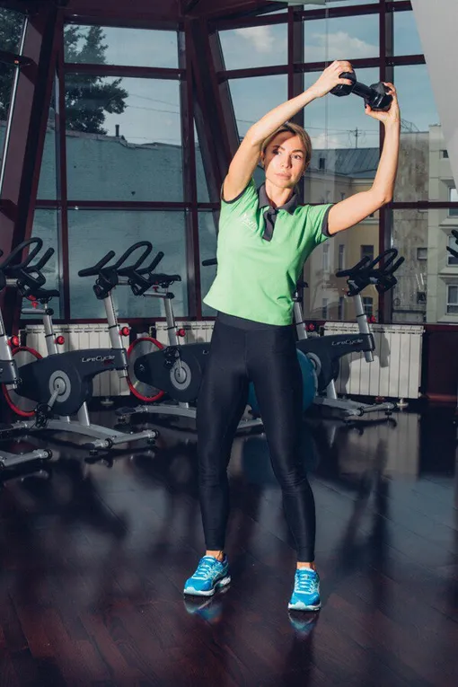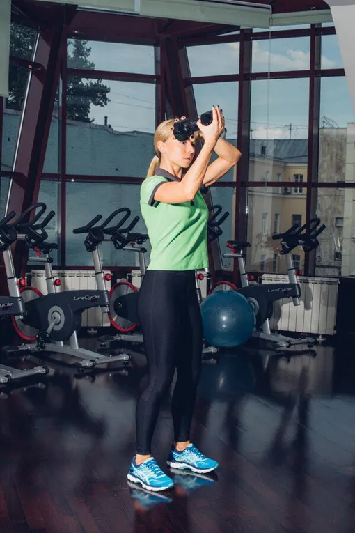 — Исходное положение: Встаньте ровно, колени чуть согнуты, таз подайте вперед, контрлируйте мышцы центра, плечи опущены вниз, локти направлены в потолок. Держим гантель за головой, разгибаем предплечье в локтевом суставе 8 раз.