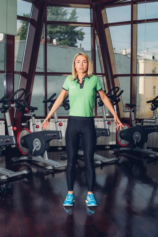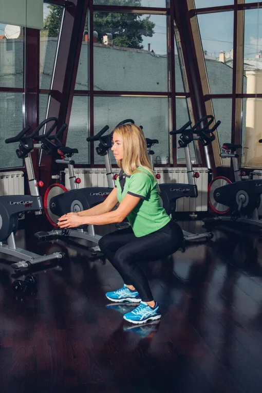 — Согните ноги в коленях, бедра должны быть параллельны полу — как будто вы садитесь на стул. Лопатки сведите, колени не должны выходить за границу стоп.