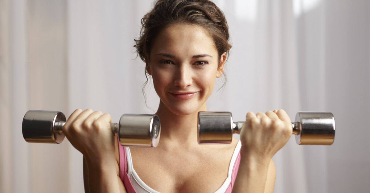 — Исходное положение: руки вдоль корпуса, гантель держите перед собой.