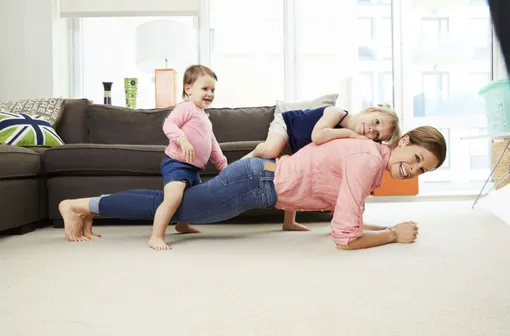 Сделайте планку, стоя на пальцах ног и локтях. Если сложно, делайте планку с коленей. Позвольте детям, если они маленькие, ползать по вам и под вами. Удерживайте тело в этом положении, сколько сможете.