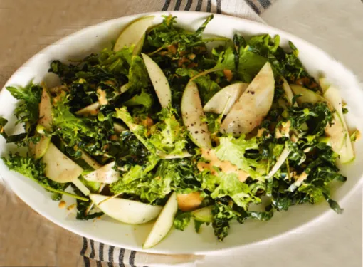 3. В большой миске аккуратно смешайте нарезанную капусту, яблоко и салат с заправкой. Приправьте по вкусу солью и перцем.
