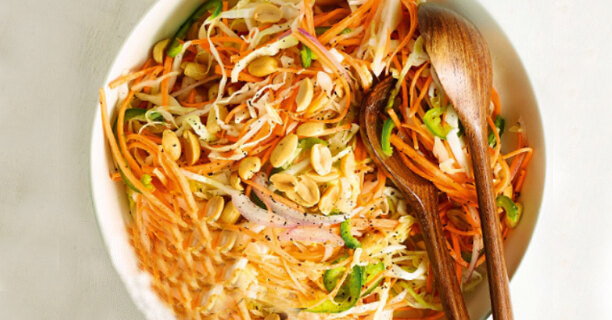 2. Тонко нашинкуйте морковь, лук, капусту, сладкий и острый перец, полейте заправкой, перемешайте и посыпьте арахисом.