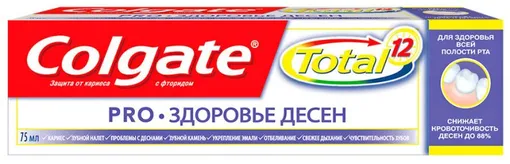 Зубная паста Colgate Total 12 Pro — Здоровье Десен, созданная по уникальной формуле, борется сразу с несколькими проблемами здоровья десен — воспалением, кровоточивостью, а также способствует предотвращению наиболее частых проблем полости рта, таких как зубной налет, зубной камень, эрозия эмали и изменение цвета зубов. Средство эффективно удаляет бактериальный зубной налет, что обеспечивает защиту десен и поддержание здоровья всей полости рта. Эффективность зубной пасты Colgate Total 12 Pro — Здоровье Десен доказана многолетними клиническими исследованиями.