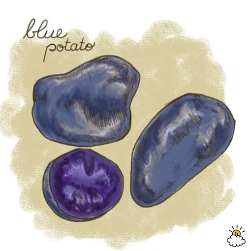 Клубни фиолетового картофеля имеют продолговатую форму, тёмно-фиолетовую окраску кожуры, фиолетовую окраску мякоти. Необычный цвет овоща сохраняется даже при термической обработке.