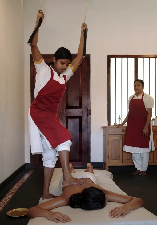 Уникальность калари в том, что массажист работает ступнями и воздействует на ваше тело всей силой собственного веса. Сразу хочу обратить внимание на очень важный момент: если записываетесь на сеанс впервые, обязательно уточните, сможет ли вас перед массажем проконсультировать врач, потому что весьма вероятно, что ваш индийский массажист не говорит по-русски. С одной стороны, это внушает доверие — мастер аутентичный и освоил технику непосредственно на родине этого массажа, но с другой стороны, если в процессе у вас возникнут вопросы или пожелания, они останутся без ответа. А поскольку воздействие на организм довольно сильное, лучше пройти хотя бы минимальный инструктаж.