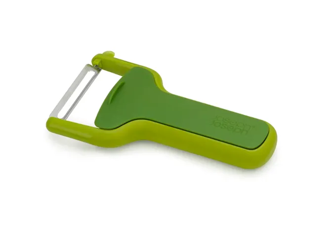 Не совсем обычная овощечистка с горизонтальным лезвием подходит не только для очистки шкурки картофеля и моркови, ей также можно нарезать кружочками огурец, очищать цитрусовые от толстой шкурки и разделывать фрукты, например, помело или грейпфрут. А ещё можно удалять сердцевину и косточки из огурцов, кабачков, перцев, дыни или тыквы. Овощечистка выполнена из нержавеющей стали и безопасна в использовании за счет специальной металлической крышки, которая не дает порезаться.