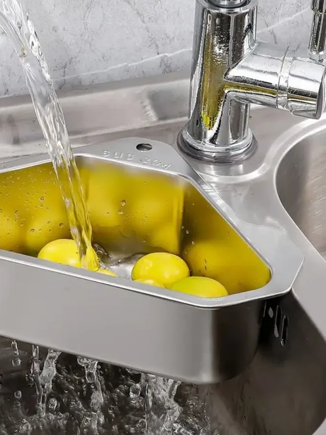 Очень простое приспособление в виде уголка из нержавейки, которое крепится к мойке. Держится крепко, подходит под любой угол мойки, не падает. Смысл такого сита простой: можно мыть фрукты, овощи, зелень, можно использовать для разморозки продуктов, сушки столовых приборов или собирать всё, что обычно сливается в раковину и попадает в слив. Особенно пригодится в дачном доме с автономной канализацией. Посуду мыть не мешает, но если нужна мойка целиком, например, чтобы отмыть противень, в любой момент можно снять