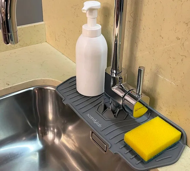 Очень удобный защитный силиконовый коврик для тех, кому неудобно протирать столешницу за смесителем. Коврик просто навешивается на кран, а специальные направляющие помогают лишней влаге стекать сразу в мойку. Коврик – не только хорошая защита столешницы от воды, грязи и плесени, но и простейший органайзер для губок и мочалок.