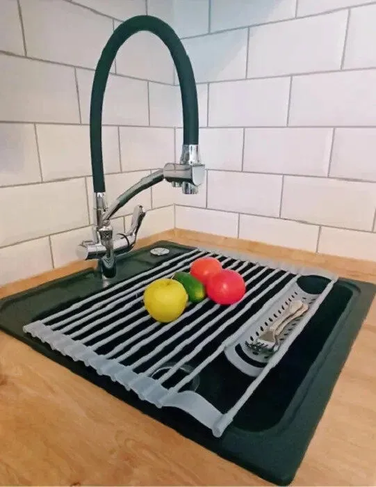 Простое решение — решетка, которая устанавливается в саму раковину. С её помощью можно организовать место для сушки посуды, фруктов, зелени и овощей, ну и губок с мочалками. Расстелите ее на раковине и положите сверху то, что нужно просушить. Самое главное, что вокруг мойки не будет постоянной сырости. Когда сушилка не нужна, её легко свернуть в компактный рулон.