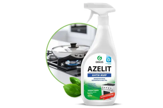 Одно из таких средств, которое быстро справляется со сложными жировыми отложениями и застарелыми загрязнениями – Azelit «Антижир», но оно не подходит для духовок и плит из стеклокерамики, а также пластика. Слишком агрессивное средство, имеет резкий запах, а при неправильном использовании можно испортить поверхности. Необходимо четко следовать инструкции и защитить или снять поворотные ручки на плите.