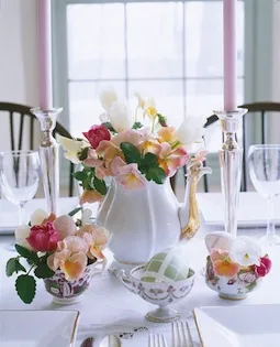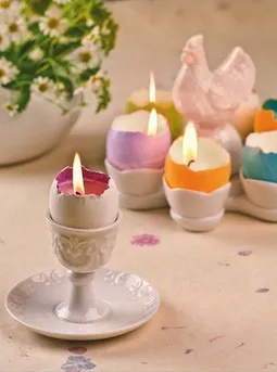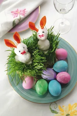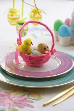 Пасхальный стол для маленьких гостей — всегда яркий и веселый. Чтобы малыши не заскучали, постелите вместо скатерти лист бумаги и поставьте на стол стаканчики с цветными мелками для рисования. Превратите леденцы на палочке в съедобные цветы, вырезав из бумаги лепестки и вставив в их центр конфету. На каждую тарелку поместите маленькую игрушку с именем приглашенного гостя.