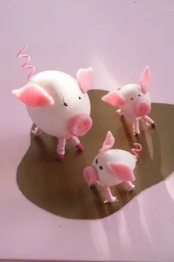Мастерить поросят — одно удовольствие. В яйце сделайте дырочку и вылейте содержимое. Покрасьте скорлупу акрилом. Ушки и пятачок слепите из марципановой мастики, ножки сделайте из спичек, а хвостик из канцелярской скрепки.