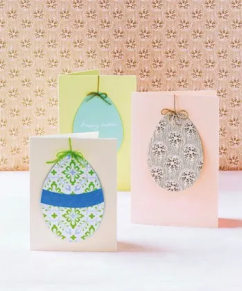 Для пасхальной открытки понадобятся оберточная бумага, суровые нитки и цветной картон. Из бумаги (или красивой ткани) вырезаем яйцо-овал. Чтобы получилась открытка, складываем картон пополам. К лицевой стороне прикладываем яйцо. С помощью иголки в верхней части яйца и открытки делаем сквозную дырочку. Продеваем в нее нитку, перекидываем через край открытки и завязываем на бантик.