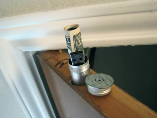 Можно сделать из упаковки от сигары или лекарств. Абсолютный лидер по скрытности. А самым надежным местом для нее будет внешняя входная дверь: ни один из злоумышленников не станет искать ее там, они все норовят поскорее зайти в дом.