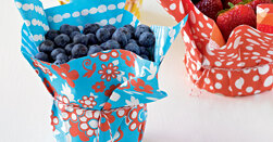 Возьмите банку или высокий стакан, наденьте на него небольшой пластиковый контейнер и оберните его квадратным листом бумаги (со стороной 25 см). Прижмите бумагу, чтобы она повторила форму контейнера, закрепите резинкой и обвяжите красивой тесьмой. После этого контейнер можно снять со стакана.