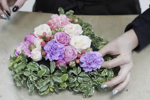 Выбирайте любые из тех, что особенно нравятся вам и вашим близким. В качестве флористического декора для нашего сердца мы использовали кустовые розы, гвоздики, гиперикум (ягоды) и питтоспорум (зелень).