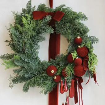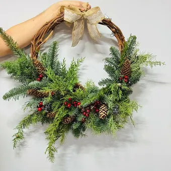 Самое важное в этом деле — основа венка. Её можно приобрести один раз и использовать из года в год. Заготовки легко найти на маркетплейсах, но если нет желания ждать доставку, сделайте основу сами — из тонкой металлической вешалки. Собирать новогодний венок проще всего из природных материалов: подойдут вечнозелёные хвойники: конечно, елки, туи, можжевельники, тис и самшиты. Отлично дополнят декор маленькие сосновые шишки, травы и сухоцветы.