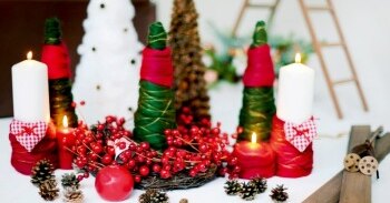 С помощью лоскутков ткани и шерстяных ниток можно оформить простые свечи.
