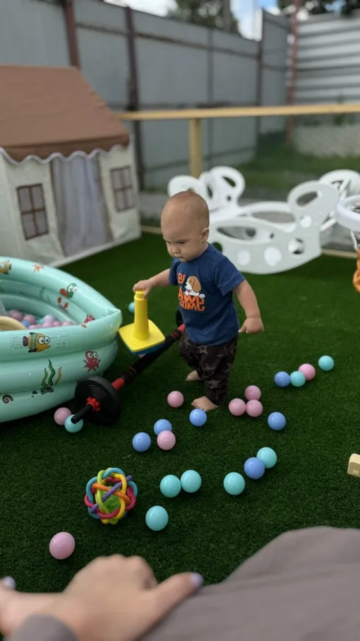 Когда площадка была готова, настала пора самого интересного — наполнения. Наталья остановила свой выбор на игровом комплексе для детей до трёх лет с горкой, качелями, «сухим» бассейном, стойкой с баскетбольным кольцом и футбольными воротами. Купили на маркетплейсе и собирали всей семьёй — старшие дети всё скрутили даже без инструкции, по фотографии.