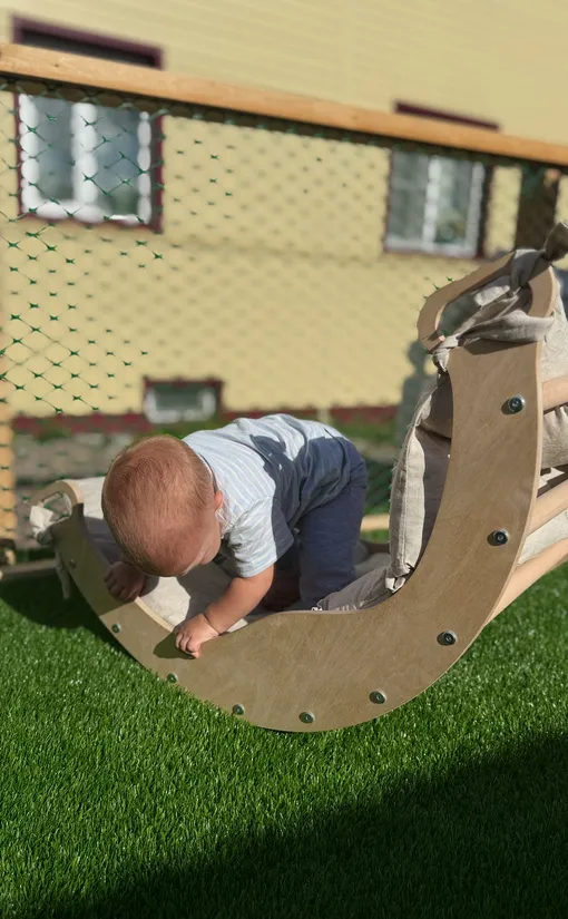 Качели-трансформер, которые при желании можно перевернуть и использовать как стол для творческих занятий, понравился и малышу, и детям постарше. Также семья приобрела арку-качалку из дерева в комплекте с льняным матрасом. Однако для годовалого ребёнка она не подошла — Платон пытался раскачиваться, но бился головой о деревянные перекладины, так что арка переехала в дом, в комнату средних сыновей.